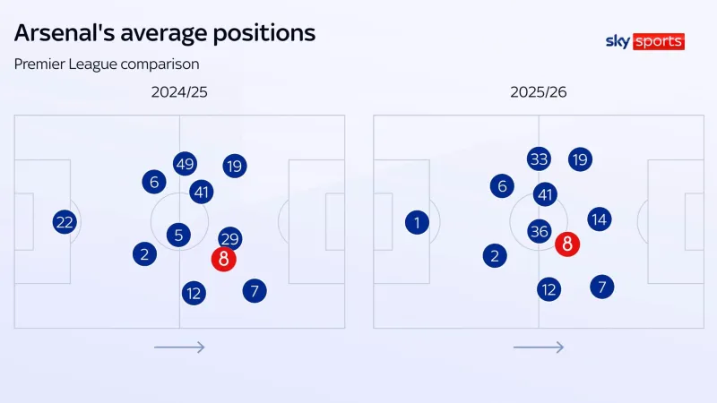 位置交換讓阿森納的對手難以應(yīng)對,而厄德高在適應(yīng)新要求方面展現(xiàn)了戰(zhàn)術(shù)智慧。與本賽季相比,球隊的平均站位顯示他的位置更靠后了。